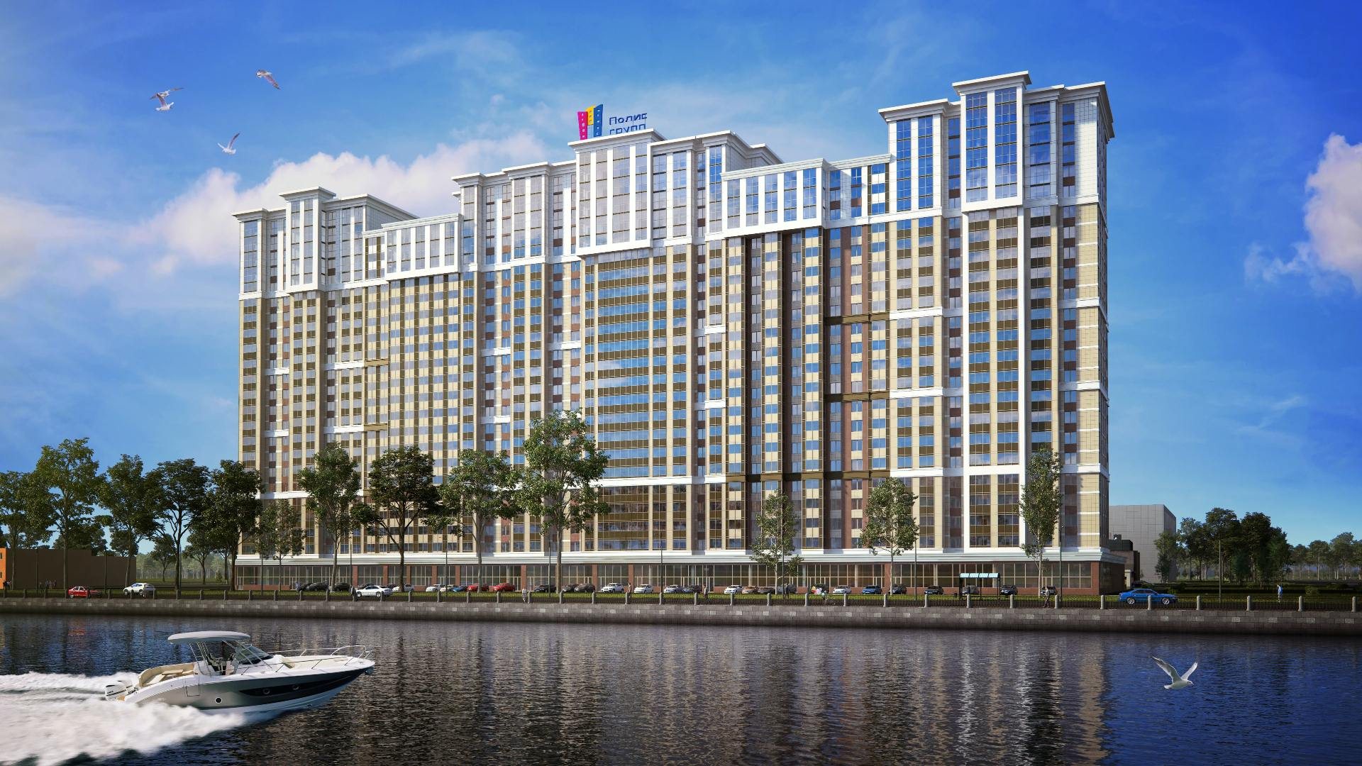 «Полис на Неве» построен на Октябрьской набережной и состоит из двух корпусов переменной этажности (21-23 этажа).