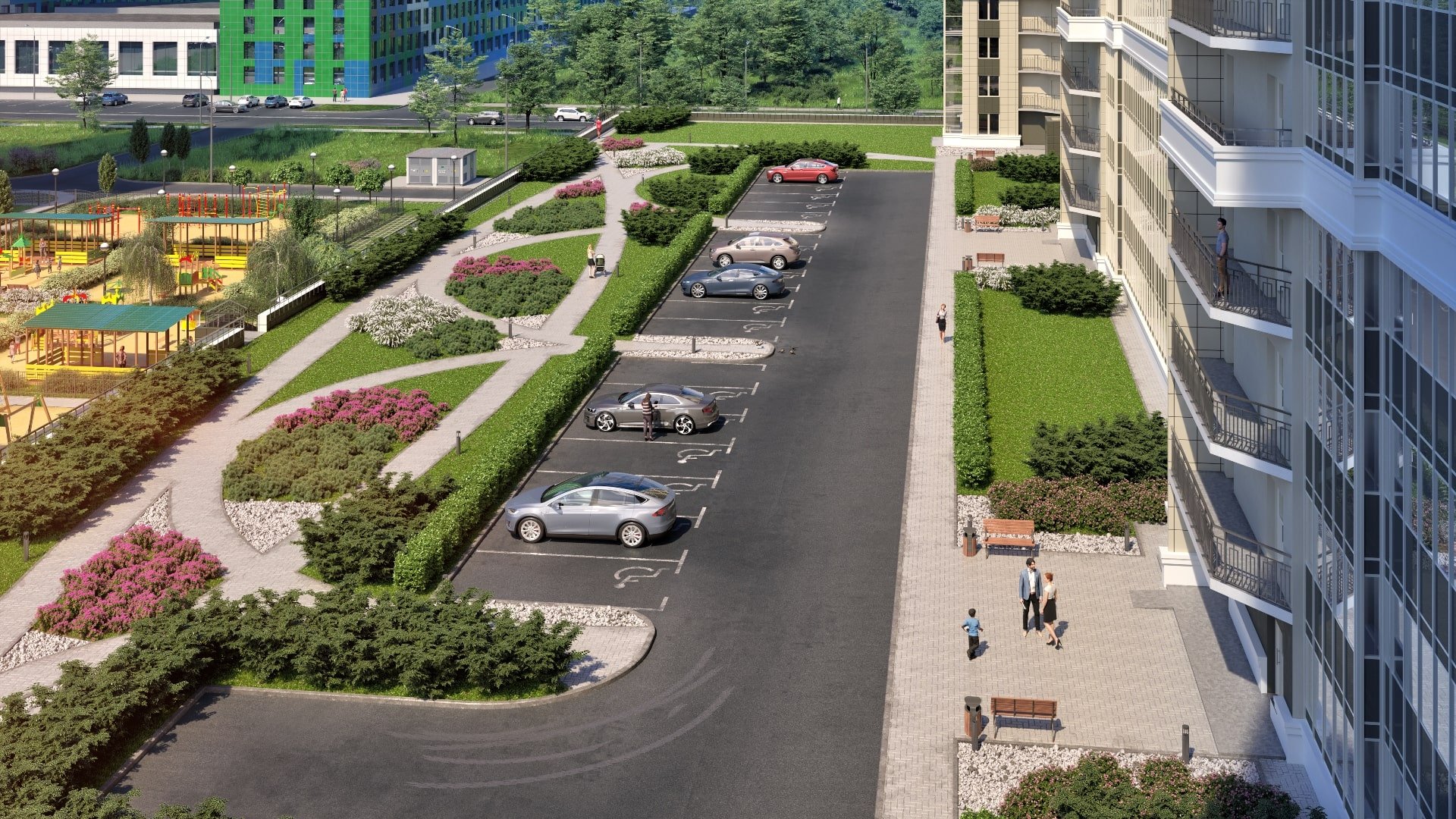 «Полис на Неве» реализует концепцию «двор без машин», въезд автомобилей специальных служб контролируется шлагбаумами, а для жильцов предусмотрен подземный паркинг на 536 машиномест.